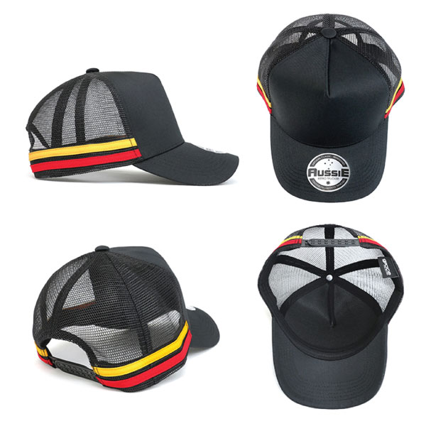 The Meanjin Trucker Cap is made from polycotton with a mesh backing and has a snap back fastener at the back of the cap. The cap has a classic structured peak and contrasting stripes around the sides & back of the cap.