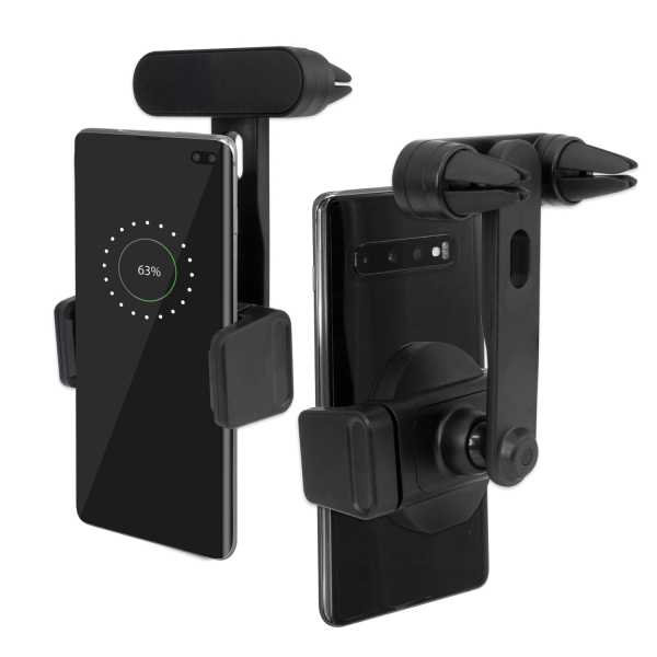 Our Metro Wireless Charging Phone Holder is a unique spring-loaded car phone holder which has a built in 5W wireless charger. It has a soft rubber clip which pushes onto car air vents and securely holds a phone so it can be used and charged at the same time. Simply plug the unit into the USB port of a car adapter and it is ready for use. It is compatible with devices that are enabled for wireless charging and will charge most modern phones. It is supplied with a Micro-B USB cable and an instruction leaflet.
