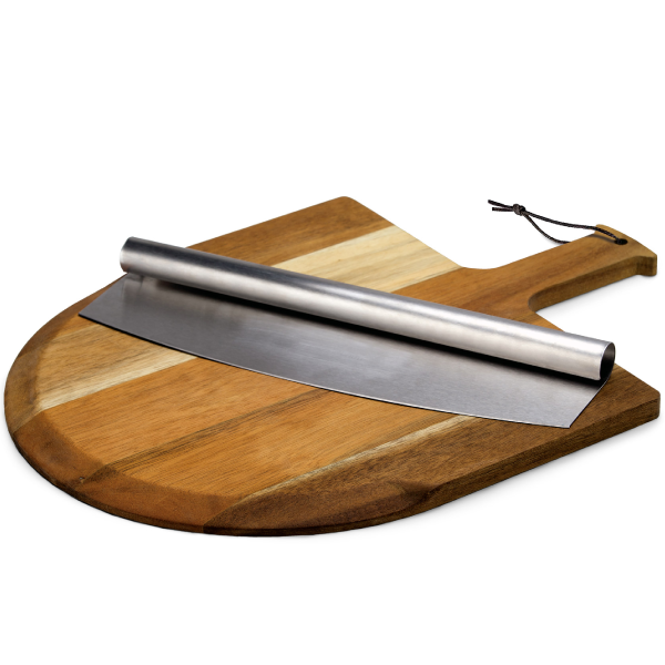 This beautiful plantation grown Acacia hardwood pizza peel will showcase not only your gorgeous pizza but also your company logo. Priced here for engraving in 1 position on the board, your clients will associate your logo with good times & good pizza! It comes complete with a stylish pizza cutter and is presented in a 2 part gift box, which makes this an ideal gift for your clients & even family members. The board has a bevelled edge and integrated carry handle along with a leather loop, which can be used to hang up in storage when not in use. The board will be one of a kind due to the unique wood grain and subtle patina finish. If you love pepperoni, ham & pineapple or just a simple Margherita, this pizza peel will make your pizza look amazing!