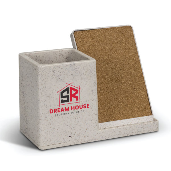 Keep organised and neat with this 10W wireless charger that also features a desk caddy. It made with wheat straw fibre, ABS and cork. Wireless fast charging is done on the cork pad for most modern phones. Micro-USB is included that can be plugged to a 5V/2.4A main adapter for optimum charge. Instruction manual is included.
