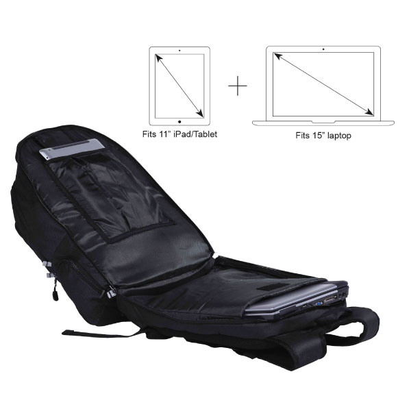 - Fully cell foam padded lay flat 15" laptop compartment with Velcro closure with additional tricot lined iPad/tablet pocket