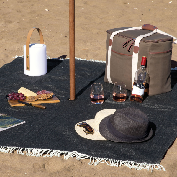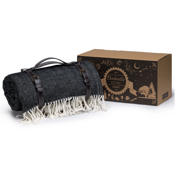 Picnic in style with the Ombrello Picnic Blanket! This 100% acrylic herringbone woven blanket also features a waterproof polyester backing to keep you and your picnic safe from the damp ground. It has a centre integrated umbrella hole, so you can keep the sun off your picnic. It has dark brown faux leather harnessing straps with a carry handle & antique finished brass accessories. Priced here for a 1 colour print on the kraft presentation box.