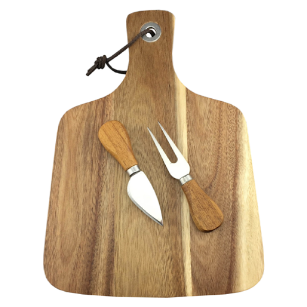 - Robust Acacia wood cheeseboard with cheese knife & fork