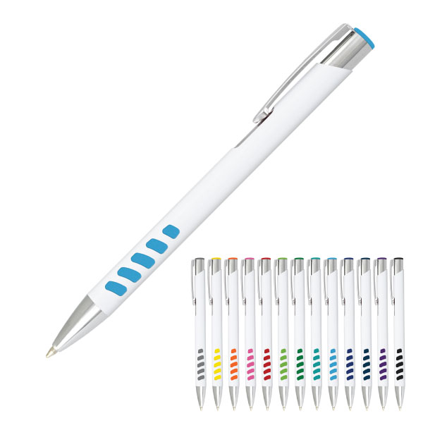The Pearce Grip Metal Pens – White are super stylish with a painted white gloss barrel and coloured silicone grip and matching end cap. It’s a retractable pen made with aluminium and has shiny chrome accents. Comes with black ink refill. Pen sleeve or a gift box available on request.