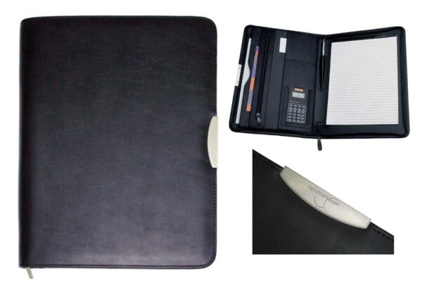 The Pinjarra A4 Portfolio includes zipper closure, pen loop, internal pocket, solar calculator and A4 lined pad which inserts from the top. Pen not included. Metal badge engraves champagne. See image for product colour.