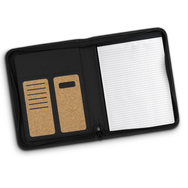 Make work more interesting with this modern A4 Portfolio, manufactured from cork with a zippered closure. Other features include a lined paper pad, a pen holder, six business card slots, a pocket for notes, and a large slip-side pocket for documents. When the cork is harvested only the outer bark is removed from the tree. This allows the tree to continue growing and replenishing the bark. It also has the benefit of a comfortable soft-touch texture while being very durable. The portfolio is presented in an unbleached kraft cardboard sleeve. Priced here for a full colour print, your branding will really stand out.