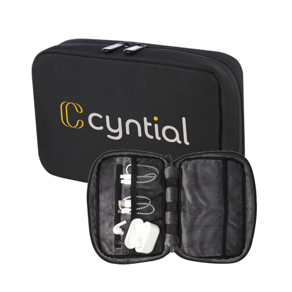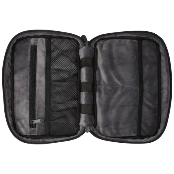 The Ramsay is a versatile hardshell organiser pouch made with durable 900D GRS recycled polyester and GRS recycled velvet lining. It features two sleeve pockets, mesh pockets, elastic straps at the bottom for cables and a zipper pocket for additional accessories.