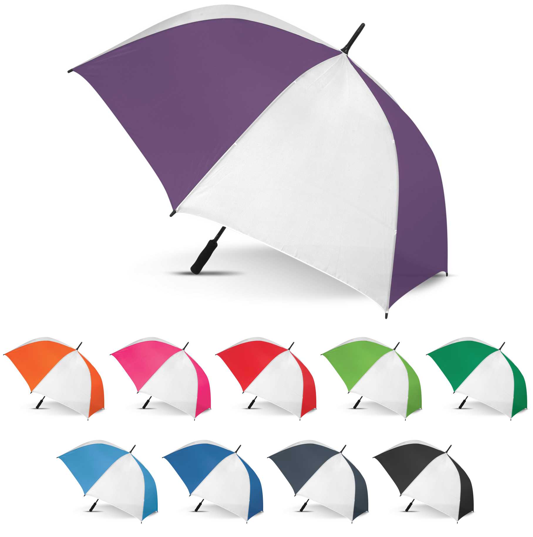 The Renegade Contrast Sports Umbrella is a premium automatic opening, eight-panel sports umbrella with a strong 190T showerproof polyester canopy which has 76cm ribs. It has a windproof eight-rib fibreglass frame and a fibreglass shaft with a soft EVA hand grip. Other features include plastic tips, a Velcro tie and the option of full colour sublimation branding on the white panels.
