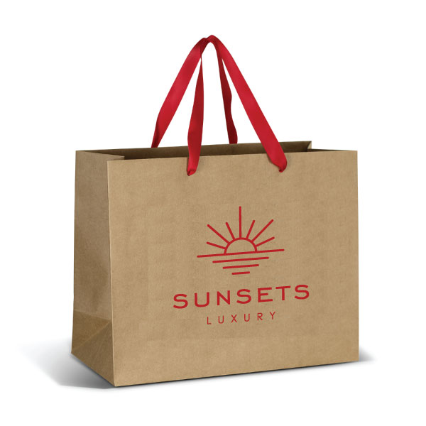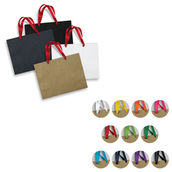 This professional and classy paper bag is made out of 180gsm FSC-certified material and coloured ribbon handles. This bag has a reinforced gusset and top edge for strength. This is perfect for gifting and event giveaways. You can full colour print on the white and natural bags only.