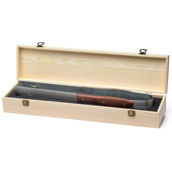 These BBQ tongs are the perfect tool for your next BBQ or just for cooking your favourite steak in the kitchen. Made from stainless steel with beautiful rosewood handles, the tongs will stand out from the rest! The tongs are beautifully presented in a natural pine, double hinged box, so they make a perfect gift for clients, friends or family. The tongs are extra long at 20″ and have a 2.5mm thickness, so not only beautiful but sturdy too! Priced here for laser engraving on the gift box. We can also print the box and engrave the handle of the tongs, so ask our friendly staff for pricing