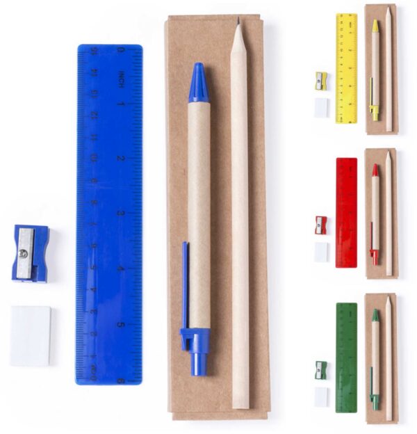 The Schema Stationery Set is a set of 5 pieces in a varied range of bright tones presented in natural cardboard box. Includes push-up mechanism ball pen and blue ink in recycled cardboard, wooden cylindrical body pencil, pencil sharpener, eraser and 15cm ruler.