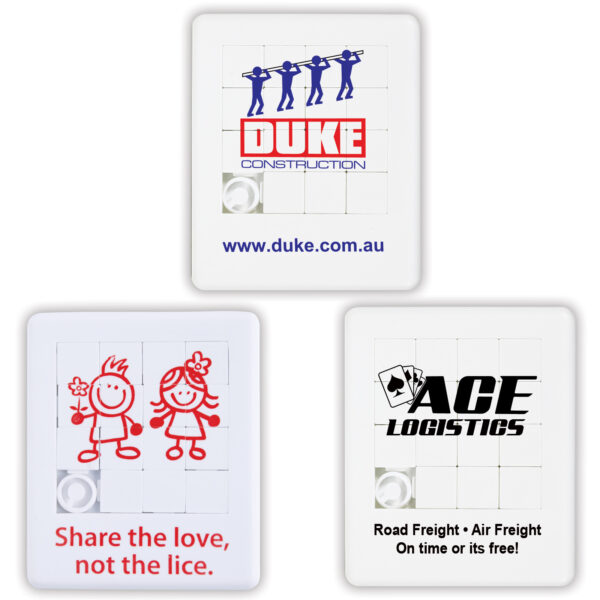The Sliding Tile Puzzle is a low cost fun way to promote your brand or message at any event. The white square shaped puzzles has 15 movable tiles to test out once print has been scrambled.