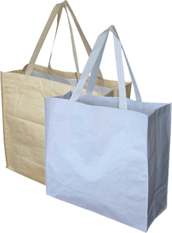Our Tuff Tote Mega Shopper Bag is our largest paper style bag with white PP woven, lined interior. They feature non woven handles with piping and are capable of carrying heavy loads. They are also water resistant, tough and durable making them a great choice for many uses. An excellent, budget option for an eco friendly campaign or event.