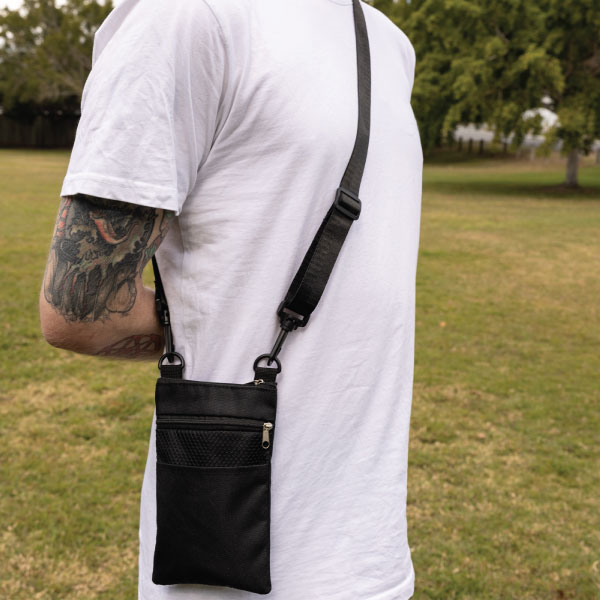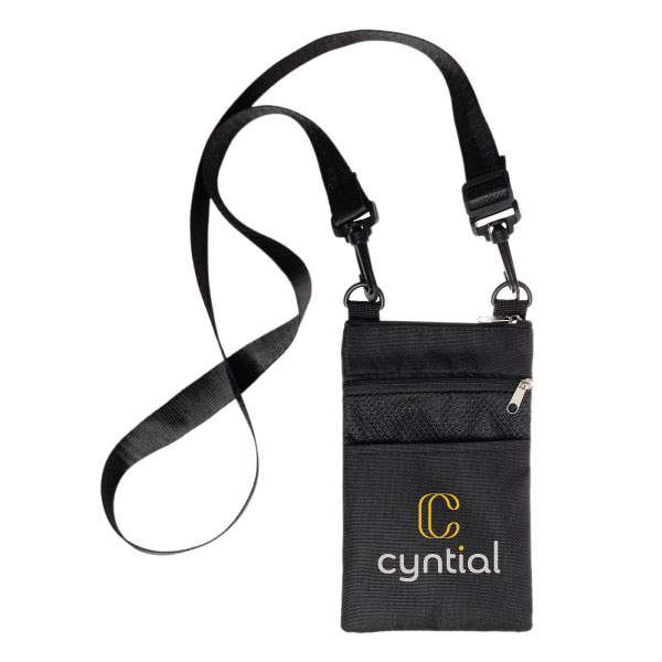 Keep your hands free while out and about with this RPET neck pouch. It's made from durable RPET 600D material and includes two zippered compartments and an open pouch. Perfect for travel as it's versatile and provides easy access.