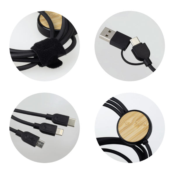 The Zander Bamboo Connector Cable is a versatile Type-C charging cable that is 1200mm long. It has a dual input of USB-A and Type-C and triple out of Type-C, Micro-B USB and lightning. Along with the bamboo panel, there is also a velcro cable tie. The cable is presented in a black cardboard box.